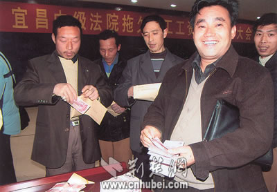 2004年12月22日,民工在宜昌中級(jí)法院領(lǐng)取執(zhí)行回的工錢(qián)。
