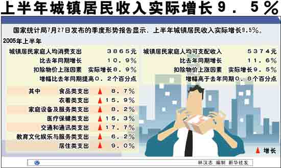 國家統(tǒng)計局進行的抽樣調(diào)查顯示,上半年城鎮(zhèn)居民家庭人均可支配收入為5374元,比去年同期增長11.6%,扣除物價上漲因素,實際增長9.5%,增幅高于去年同期0.8個百分點。