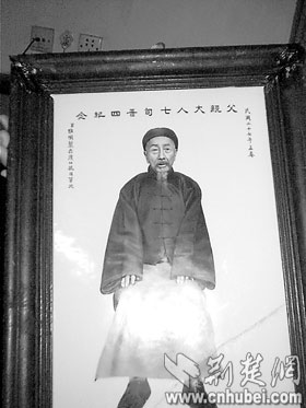昨日,記者在湖北省社會科學(xué)院劉女士家中,見到了這塊漢繪瓷板畫。白色的瓷板鑲嵌在木制相框中,瓷板畫中間是一幅手工繪就的人像,畫中老人正襟危坐,含威不露,瓷板上端是“父親大人七旬晉四紀(jì)念”,右批為“民國二十七年孟春”,左批“男惟明制于漢口抗日軍次”,下端有“漢口榮康瓷業(yè)公司精繪”的小字(如圖)。