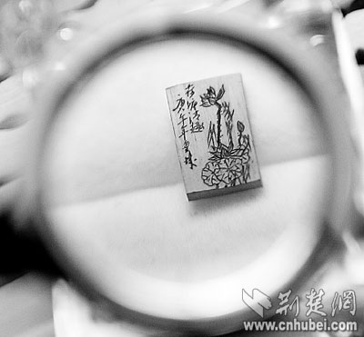 荊楚網(wǎng)(楚天都市報)(記者何君輝實習生周中華)寫意的中國山水畫,形態(tài)各異的花鳥蟲魚,憨態(tài)可掬的國寶大熊貓,風格迥異的詩詞……承載它們的,竟然是如米粒大小的象牙片或動物骨片。昨日,記者在微雕藝人童洪斌家中,手持放大鏡,領略了他的微雕絕活。
