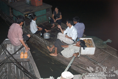 浮橋下面,江面的幾戶漁家把船靠上浮橋,聚在一起拉家常,享受著一天勞動的喜悅,也將自己一天捕獲的魚蝦擺上橋面,等待買家,聽著他們歡快的笑聲,知道他們該是有了一個好的收獲。