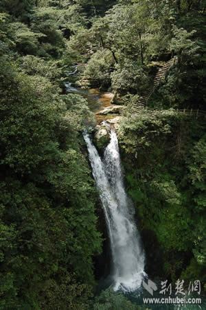 參觀完兩處紅色旅游景點(diǎn)之后,記者們順道觀光了龍?zhí)讹L(fēng)景區(qū)。龍?zhí)段挥诖钠何鞅逼吖,是近年來開發(fā)的以自然與人文景觀相結(jié)合的旅游風(fēng)景區(qū)。據(jù)介紹,當(dāng)?shù)氐奈迳窈邮驱執(zhí)丁拔逄妒似佟钡脑慈O疀_擊小井峽谷后,陡然跌落絕壁之下,又連續(xù)飛下四級斷崖,形成梯狀的五個氣勢磅礴的瀑布和深潭,這就是碧玉、金鎖、珍珠、飛鳳、玉女等五潭五瀑。細(xì)察五潭,碧水泱泱,樹影幢幢,崖壁如刀削斧鑿,崖腳怪石,汀芷競秀,綠蔭覆蓋四周。仰觀五瀑,潭潭無俗水,瀑瀑似神女。