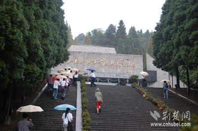進(jìn)門后,展現(xiàn)在人們眼前的是109級臺階,威嚴(yán)肅穆的紀(jì)念堂就矗立在山頂上。導(dǎo)游小姐告訴記者,這些臺階分為兩組,第一組49級,象征1949年新中國成立。第二組60級,寓意陵園是在井岡山革命根據(jù)地創(chuàng)建六十周年的1987年建成。