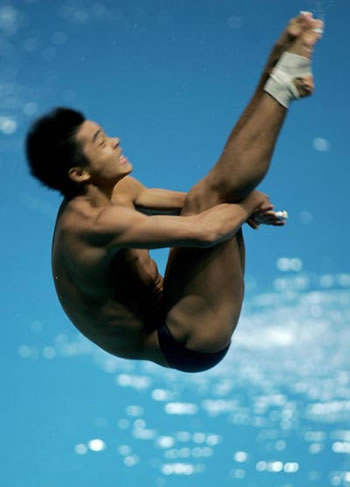2005年10月5日,十運(yùn)會(huì)跳水決賽最后一天的比賽在南京奧體中心落幕。在男子單人1米板的決賽中,預(yù)賽中排名第一位的廣東新秀何沖一掃在3米板比賽中沖金失利的陰影,憑借最后兩跳近乎完美的表現(xiàn)以總成績(jī)500.01分獲得冠軍。上海老將王天凌則以490.32分獲得銀牌,另外一名廣東選手羅玉通以466.53分摘得銅牌。解放軍名將彭勃和代表山東參賽的衛(wèi)冕冠軍王峰則因?yàn)樵诒荣愔谐霈F(xiàn)重大失誤,分別以447.12分和435.66分名列第五和第八位。圖為何沖在比賽中。(中體在線圖片 李錦河 攝)