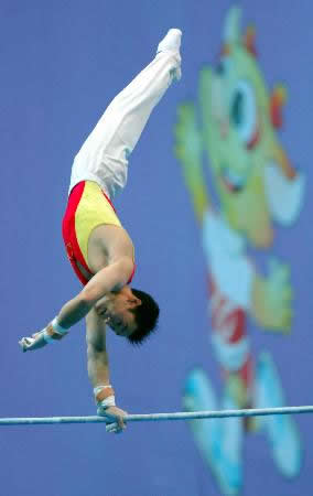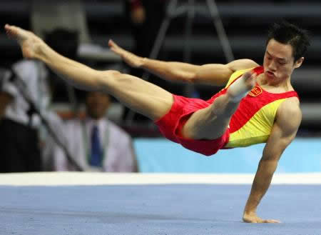 10月13日,湖北選手楊威在自由體操比賽中。當晚,十運會體操男子全能決賽在南京奧體中心舉行。楊威最終奪得銀牌。(新華網(wǎng))