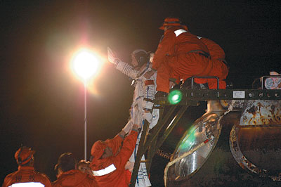 費俊龍、聶海勝隔著舷窗,在向人們招手———返回艙內(nèi)柔和的燈光,映著他們的微笑。這一刻,距他們離開大地4天又19個多小時,他們的總行程為325萬余公里。
