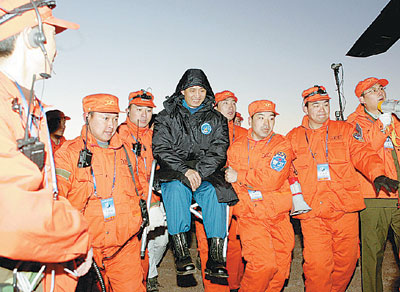 5分鐘后,兩名航天員在工作人員的簇?fù)硐,進(jìn)入著陸點100米開外的一架直升機內(nèi)全面體檢,工作人員和群眾在外焦急地等待最后的檢查結(jié)果。