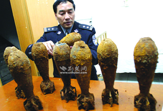 圖為警方在檢查炮彈