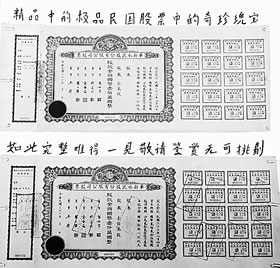 有關(guān)人士介紹,民國時(shí)期的老股票,采用了較美觀、實(shí)用的“三聯(lián)式”發(fā)行,由“存根、本票、息票”三部分組成。這兩張股票三聯(lián)俱全,如為真票,將具備較高的收藏價(jià)值。