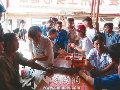 15日,參加武鋼工程建設(shè)的百余位農(nóng)民工兄弟,樂呵呵地接受了中國一冶電裝公司武鋼項(xiàng)目部為他們免費(fèi)進(jìn)行的體檢。浠水工程隊(duì)民工朱宗杰說:“這兩年來,社會各界對農(nóng)民工的關(guān)心很實(shí)在!