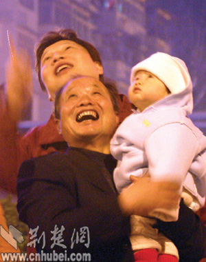 漢陽的劉春華一大家子人特別引人注目,因為他們?yōu)榇蠡镎故玖艘粓鲂⌒偷乃饺搜婊鹜頃K乃男值苕⒚,從面包車上扛下大包大包箱子般大小的焰火,依次在江邊擺開。不一會,幾道彩色的光柱就在天空閃耀,彩色幕布被拉開。震耳的轟響,讓孩子們又愛又怕,躲在父母的身后偷偷地捂著耳朵跳鬧。70多歲的爺爺奶奶微笑著,安靜地看著自己十多個子子孫孫們歡暢的一幕。