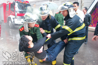 昨日上午,漢口青島路10號(hào)的鉆石酒吧在裝修中不慎引發(fā)火災(zāi),兩男子被困。危急關(guān)頭,消防兵破門而入,將二人救出。
