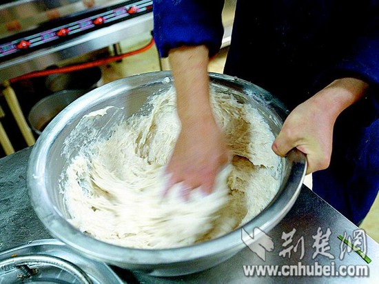 圖為:新鮮的魚肉剁成魚蓉,攪拌上勁。