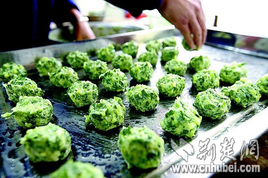 圖為:混好野菜沫的魚蓉捏制成丸子,再按扁成餅。