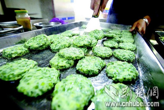 湖北日報訊 早春,野菜餅成為咸寧市百姓一道特色佳肴。制作野菜餅時,先取新鮮魚肉打成魚蓉,再將采摘的新鮮野芹菜、野韭菜等切成沫,加入魚蓉混合攪勻,制成直徑十厘米大小的小餅上蒸鍋蒸,再裹上蛋黃煎至金黃,清香撲鼻。