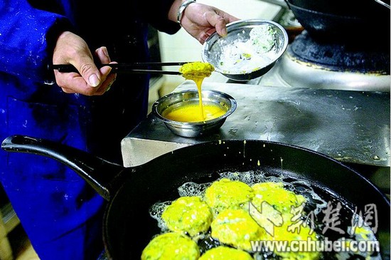 圖為:野菜餅裹上一層蛋黃入油鍋煎。