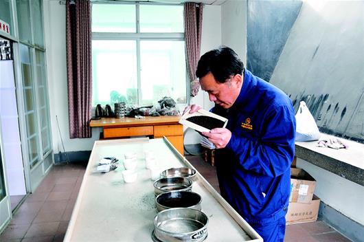 湖北省趙李橋茶廠有限責(zé)任公司檢驗(yàn)室內(nèi),59歲的甘多平將青褐色磚茶原料倒入評茶盤內(nèi),緩緩搖動后,仔細(xì)端詳、細(xì)嗅香氣,“顆粒勻、香氣正,這批原料不錯(cuò)。”