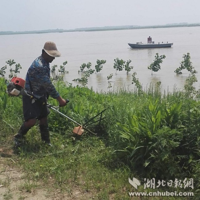 站在簰洲灣堤上,只見江水寬闊,水質(zhì)混濁,岸邊的防浪林樹干已被淹沒大半,只露出一蓬蓬的樹枝。原本空曠的堤頂公路,多了一些哨棚。內(nèi)岸邊,星散分布的群眾,手持鐮刀或除草機,正在忙碌地清障除雜。每隔一段距離,都有一個防汛哨屋,鮮艷的五星紅旗迎風(fēng)飄揚,各個分指揮部已經(jīng)設(shè)立。