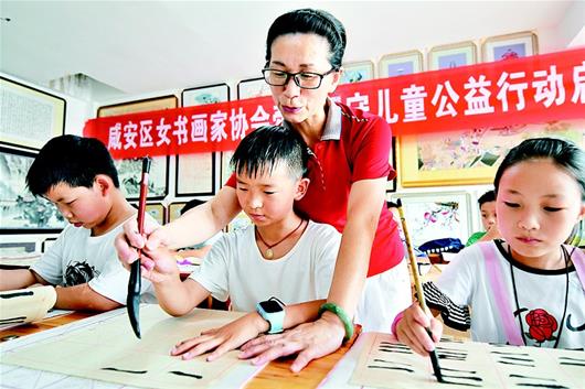 湖北日?qǐng)?bào)訊 今年暑假,咸寧留守兒童有了新去處,該市一批書(shū)道精湛、和藹可親的女書(shū)法家免費(fèi)教他們學(xué)習(xí)書(shū)法。咸寧市咸安區(qū)女書(shū)畫(huà)家協(xié)會(huì)去年成立,一直堅(jiān)持周末及寒暑假設(shè)立兩處書(shū)法授課點(diǎn),對(duì)周邊留守兒童免費(fèi)開(kāi)放。(記者劉曙松 視界網(wǎng)李旻媛 攝)