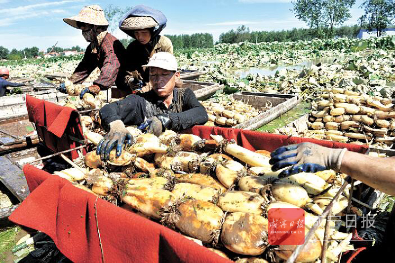 7月28日,嘉魚縣陸溪鎮(zhèn)藕塘村鴻福農(nóng)產(chǎn)品加工有限公司蓮藕基地,數(shù)10位工人正在采收今夏第一批鮮藕。