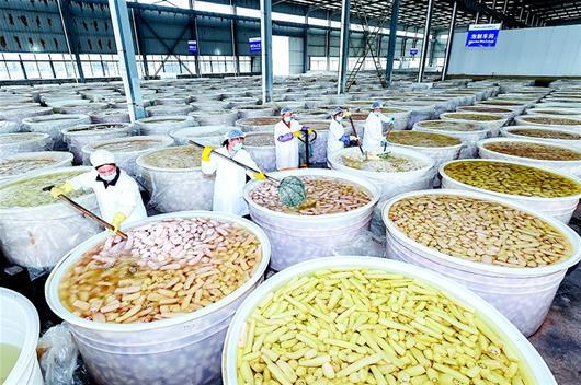 湖北日?qǐng)?bào)訊 眼下,正值蓮藕收獲季節(jié)。位于嘉魚(yú)縣陸溪鎮(zhèn)的嘉珍生態(tài)農(nóng)業(yè)發(fā)展有限公司車間內(nèi),工人們正在開(kāi)封、準(zhǔn)備啟運(yùn)泡制的蓮藕產(chǎn)品。2012年嘉魚(yú)珍湖蓮藕登上《舌尖上的中國(guó)》后名聲大噪,國(guó)家質(zhì)檢總局近日正式批準(zhǔn)“嘉魚(yú)蓮藕”為國(guó)家地理標(biāo)志保護(hù)產(chǎn)品。目前,嘉魚(yú)縣每年生產(chǎn)蓮藕、蓮子和藕帶6萬(wàn)多噸,產(chǎn)品銷往全國(guó)各地,并出口到歐美和東南亞等地區(qū)。(記者 陳勇 視界網(wǎng) 龍鈺 攝)