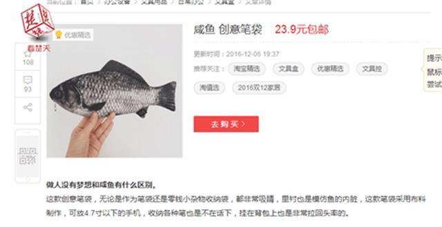 據(jù)了解,“咸魚”筆袋的主人是個(gè)初一孩子,記者聯(lián)系他的媽媽后得知,筆袋是孩子在網(wǎng)上挑選后,她購(gòu)買的。“不知道他為什么喜歡這個(gè)筆袋?!笔潞?,記者在淘寶、京東上搜索“咸魚筆袋”后,也確實(shí)發(fā)現(xiàn)了類似的筆袋。