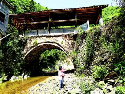 石城鎮(zhèn)文化站站長龔益來介紹,2015年6月2日暴雨,石橋部分被沖毀。他聯(lián)系上從塔坳村走出去的加拿大籍華人汪十友,募資10萬元,加上鄉(xiāng)鄰捐助,花費13萬余元于當年9月重修。為整舊如舊,橋基上的壘石仍保留當年瑤族先民的遺存,清光緒十四年的修橋記錄原樣保存在前面橫梁上,此次修橋記錄則刻在后面橫梁上。
