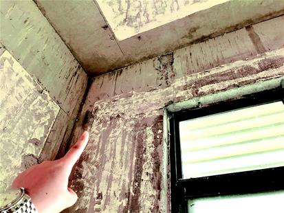劉女士介紹,樓板有多處裂縫,有幾處水泥塊已掉,客廳后門的過梁有貫穿裂縫,還有幾處梁柱有裂縫,并且房子還是斜的。