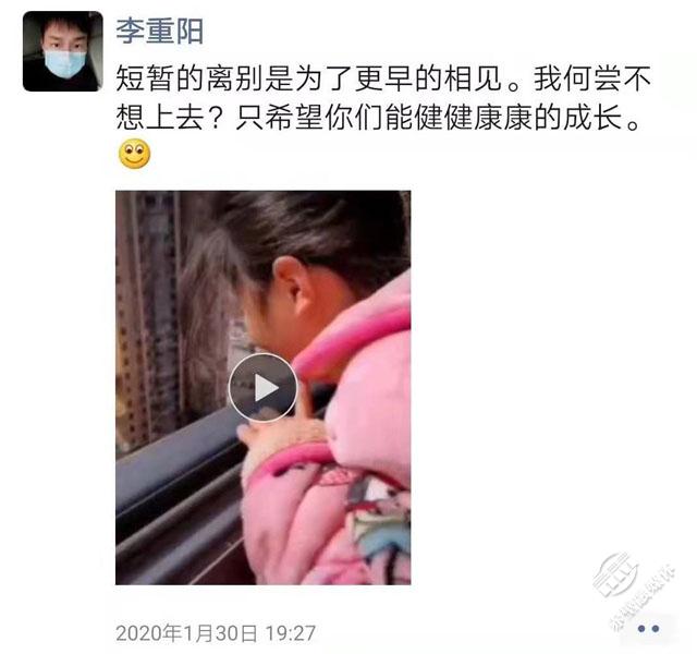 李重陽(yáng)是中心消殺隊(duì)伍中的一員,1月29日,正值大年初五,已經(jīng)近10天沒(méi)回家的他接到了到自己所住小區(qū)開(kāi)展消殺工作的任務(wù)。所有工作完成后,他只能在樓下?lián)芡ㄒ曨l,遠(yuǎn)遠(yuǎn)的看了一眼妻子,聽(tīng)著兒女叫了一聲“爸爸”。當(dāng)天,李重陽(yáng)發(fā)了這樣一條朋友圈:“短暫的離別是為了更早的相見(jiàn)。我何嘗不想上去?只希望你們能健健康康的成長(zhǎng)。”李重陽(yáng)只是赤壁疾控眾多年輕消殺隊(duì)員的一個(gè)代表。很多人無(wú)聊的“家”,正是他們一線疫情防控人員想回卻回不去的“家”。