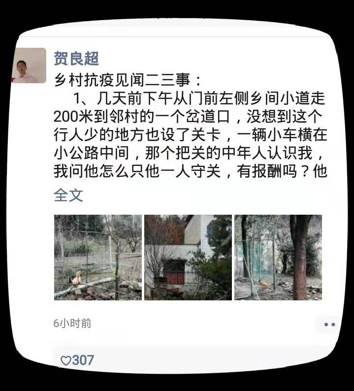 2月11日,赤壁市黃蓋湖鎮(zhèn)鐵山村一位從廣州返鄉(xiāng)村民賀良超在朋友圈里發(fā)了一條長文,寫下抗疫期間,他在鐵山村的所見所聞,原文如下: