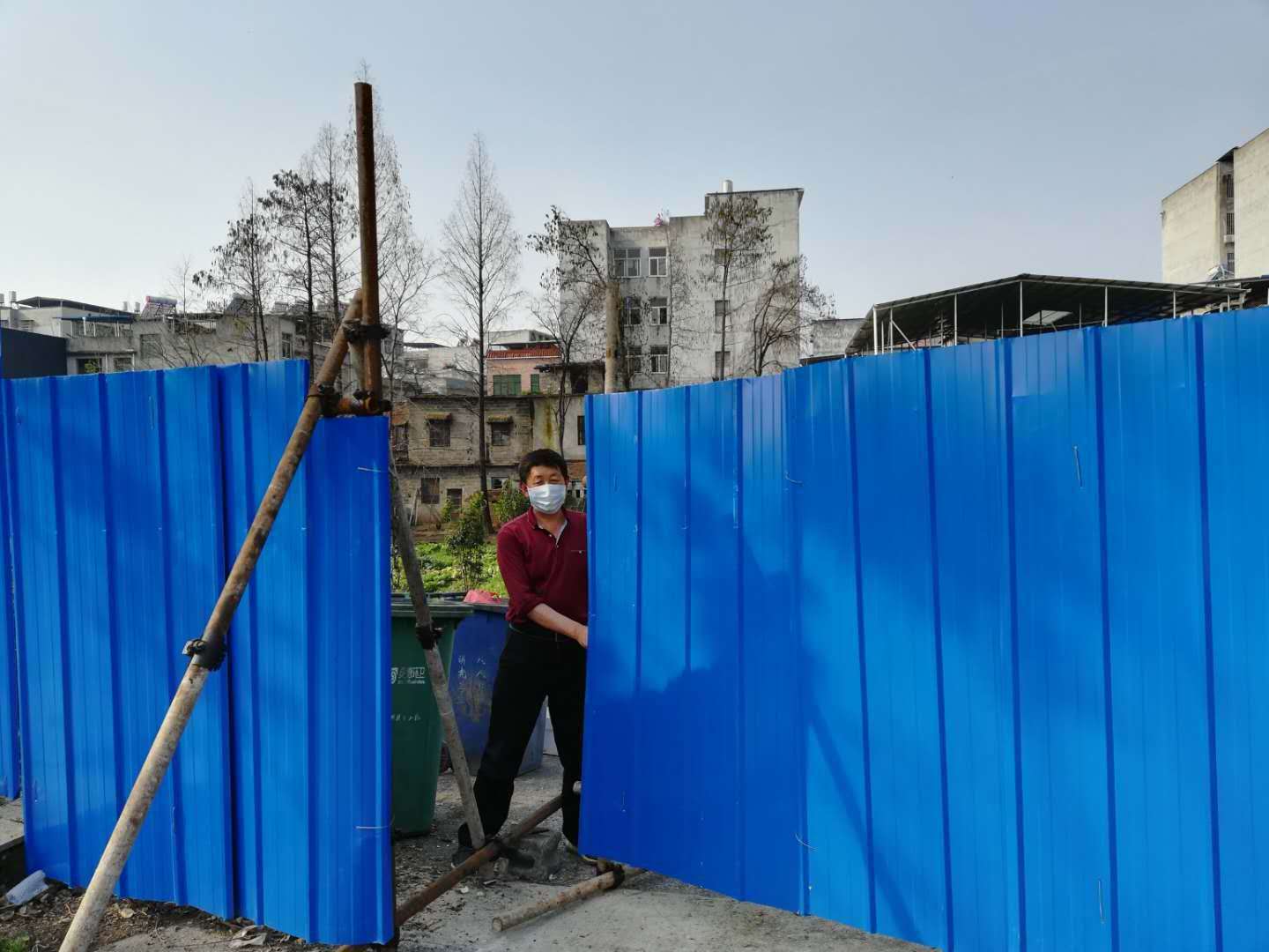 自臘月二十九日開始,村干部們帶頭上,購(gòu)買了樹木、鐵皮,立樹樁,釘鐵皮墻。大道兩邊相向設(shè)置,從南門河四橋開始,一直到城內(nèi)小區(qū)。到大年三十晚上,兩道藍(lán)色的“屏障”悄悄立起,它們“環(huán)著村、環(huán)著城”,成為斬?cái)嘁吣У摹爸旅徽小薄?/p>