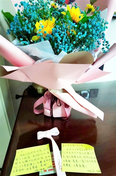 自稱為“云南小姐姐”的萬(wàn)麗萍,將一束開(kāi)得正艷的花和兩張小紙條擺在桌上?!坝窀纾遗路謩e時(shí)的淚崩,給你留了小紙條。咸寧的55天,感謝你無(wú)微不至的照顧,把我們一個(gè)個(gè)養(yǎng)得胖了一大圈。雖然回去要減肥,還是感恩、感謝!”
