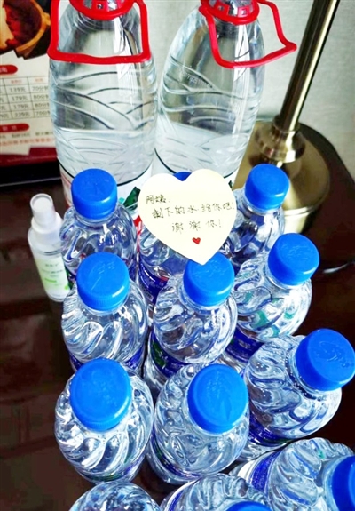 一位隊(duì)員留下了十多瓶礦泉水,并留言:阿姨,剩下的水給你們吧,謝謝你!