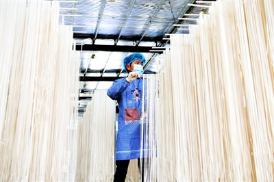 村民在沙堆鎮(zhèn)石沖村扶貧車(chē)間生產(chǎn)葛根面條