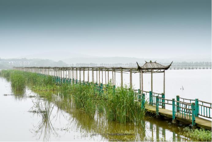 當(dāng)天,木制釣魚臺上,一位50余歲的游客在休閑小釣。垂竿拋,紅煙斂,大有一番“人疑天上坐,魚似鏡中懸”的味道。也有三兩游客櫓槳戲水,一不小心,驚擾了覓食的魚兒,“潑刺”一聲,慌亂中撲騰至遠(yuǎn)處,不見蹤影。