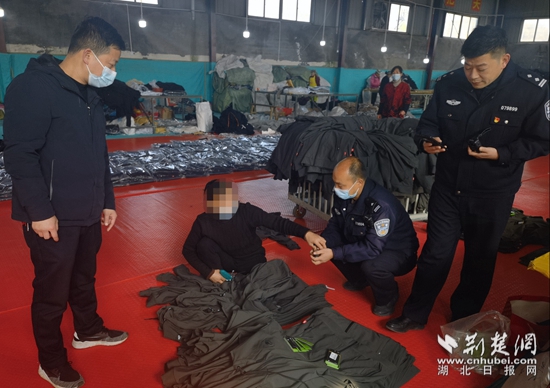1月11日中午時分,在局領(lǐng)導(dǎo)的統(tǒng)一指揮下,食藥大隊聯(lián)合武穴市市場監(jiān)督管理局和打假公司等組成近30余人的查獲組,分三組分頭同步進行,一舉查獲、查封三個生產(chǎn)加工窩點,控制董某某等涉案人員10余名,現(xiàn)場查扣高仿運動品牌服裝4萬余件,涉案價值百余萬元。
