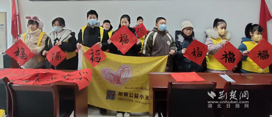 1月17日,在社區(qū)活動室只看見“紅、黃”馬甲身影在忙碌著,原來是陽新縣義工協(xié)會志愿者人稱“會拔牙和書法的義工”石祥帶領(lǐng)9名公益小天使書法愛好者,寫春聯(lián)和“?!弊郑瑢⒆蠲篮玫男麓鹤8Mㄟ^春聯(lián)傳遞給每位社區(qū)居民。一副副寓意平安和諧、吉祥如意的春聯(lián),帶著辭舊迎新的美好祝愿,為即將來臨的春節(jié)增添了濃濃的喜慶氛圍。