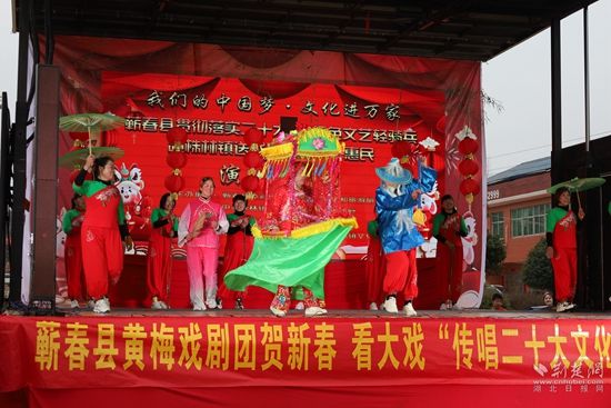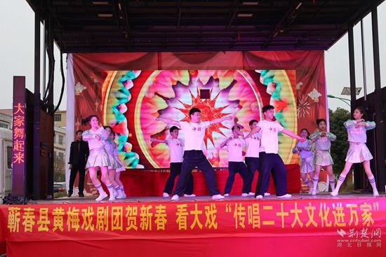 荊楚網(wǎng)(湖北日報(bào)網(wǎng))訊(通訊員凌敏、程楚輝)2月2日,由蘄春縣委宣傳部、縣文化和旅游局、株林鎮(zhèn)人民政府聯(lián)合主辦的“我們的中國夢文化進(jìn)萬家暨蘄春縣貫徹落實(shí)二十大精神+送戲下鄉(xiāng)”惠民文化演出走進(jìn)當(dāng)?shù)劓?zhèn)村一線,用黃梅戲表演唱等形式,把黨的二十大精神送到老百姓家門口,贏得群眾一片叫好聲。