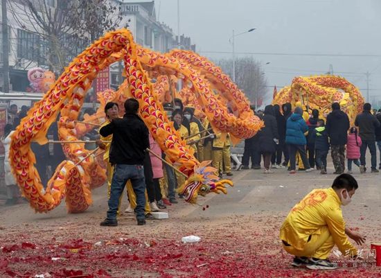 “舞一個(gè),舞一個(gè)!”舞龍隊(duì)每行進(jìn)一段距離,便會(huì)就地給老百姓來(lái)一段技藝高超的表演。師傅們舉著巨龍?jiān)谠茻衾锷舷麓┬?,時(shí)而騰起,時(shí)而俯沖,變化萬(wàn)千,配上歡快激昂的民間吹打樂(lè),一派喜慶熱烈的節(jié)日氛圍。