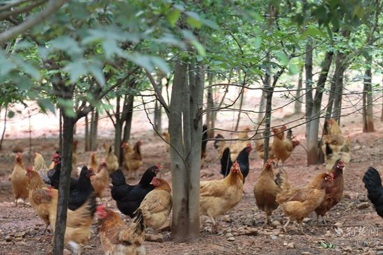 走在梓沐家庭農(nóng)場里,綠樹成蔭,微風習習?!斑@是茶梅路,那邊一條是桂花路,中間種的是三角楓,桂花路另一邊是樸樹以及一些果樹。”王智越邊走邊介紹,農(nóng)場充分利用空間發(fā)展林下經(jīng)濟,單獨劃分區(qū)域,在樹下放養(yǎng)雞鴨共計1000余只。