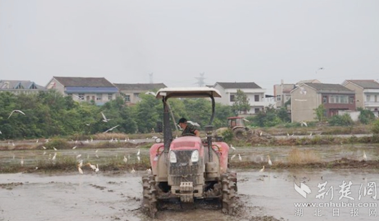 水田中,打田機(jī)來(lái)回穿梭,工人們?cè)诿χ嗨?、播種,到處都是一片生機(jī)勃勃的繁忙景象。一群群白鷺鳥(niǎo)在人與機(jī)器之間飛來(lái)飛去嬉耍,織就出一幅喜樂(lè)祥和的圖畫。
