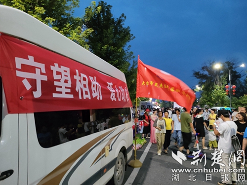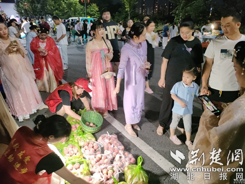 當(dāng)天下午六點,大冶市靈杰國風(fēng)志愿服務(wù)隊兵分兩路,分別在恒達歡樂大世界和雨潤廣場將農(nóng)戶的桃子一袋袋的分揀好,早早地將夜市攤擺上,為了讓路人能直觀看到桃子的品質(zhì),他們將散裝桃子一個個切好給來往的行人品嘗。