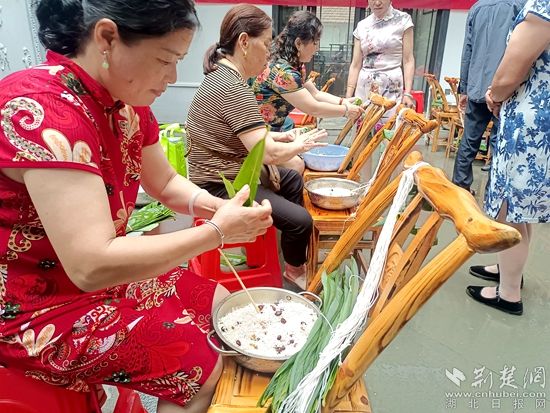 “先卷起粽葉,再填滿米,加蜜棗,再封口系繩,力道要適中。”在包粽子區(qū)域,村民張嫂子作為巾幗志愿者非常耐心地教孩子包粽子。孩子們拿著粽葉幫忙放糯米,學(xué)得有模有樣。半個(gè)小時(shí)后,粽葉、糯米、粽繩等材料變成一個(gè)個(gè)棱角分明的棕子。