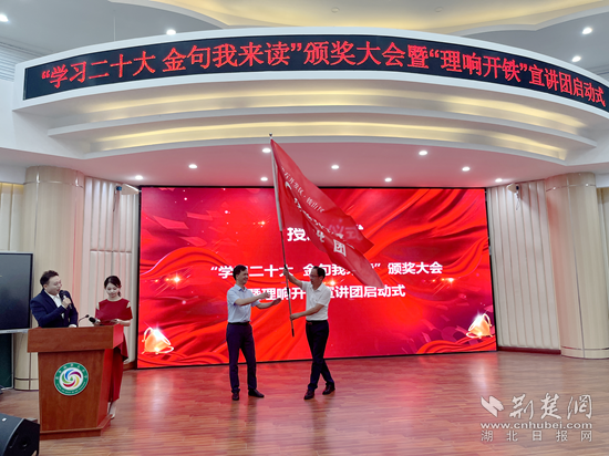 活動現(xiàn)場,出席領(lǐng)導(dǎo)為獲獎嘉賓頒發(fā)最佳創(chuàng)意獎、最佳搭檔獎、最佳作品獎、最佳人氣獎、最佳組織獎,激勵他們將黨的二十大精神記于心,踐于行,踔厲奮發(fā),篤行不怠,并共同見證了“理響開鐵”宣講團(tuán)授旗儀式。