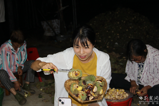 28日晚8時,與“谷哥”直播現(xiàn)場數(shù)里的大河鎮(zhèn)涼亭村,也是一片火熱。去年從深圳返鄉(xiāng)從事助農(nóng)直播的何婷也正在直播賣板栗,丈夫在一旁忙著收購村民連夜送來的板栗,婆婆就在直播鏡頭前剝板栗,一家人忙得團團轉(zhuǎn)。