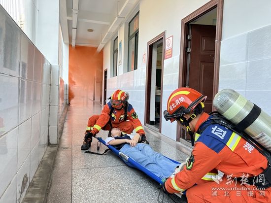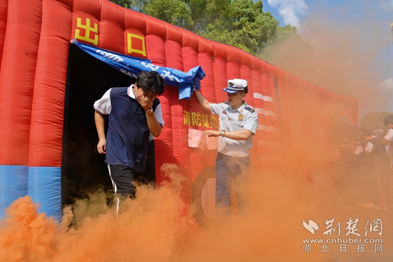伴隨著陣陣緊促的警笛聲在校園響起,一教室內(nèi)“電線短路”,引燃桌面書籍,頓時(shí)濃煙滾滾?!罢埜魑煌瑢W(xué)不要驚慌,捂住口鼻、低頭彎腰、貼墻往樓下有效進(jìn)行疏散......”廣播中傳來疏散指令,消防員指導(dǎo)全體師生從“安全出口”有序迅速撤離,通過體驗(yàn)“生命通道”,使師生掌握火場疏散逃生技能。