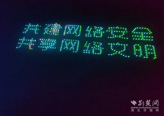 夜空中,數(shù)百架無人機(jī)以天空為畫布、以光影為畫筆,描繪出一幅幅科技與視覺的“大片”。表演融入網(wǎng)絡(luò)視聽元素和黃石、湖北地標(biāo)內(nèi)容,依次幻化成小燕子、天空之城、黃石歡迎你、地球、安全盾牌等11個畫面,最終匯集成“共建網(wǎng)絡(luò)安全 共享網(wǎng)絡(luò)文明”的字樣。