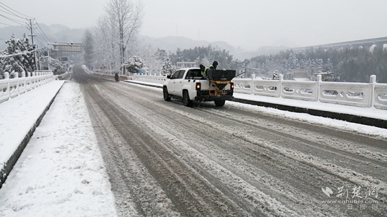 在各重點(diǎn)路段,工作人員迅速設(shè)置提示牌,并及時(shí)砍伐被積雪壓倒的楠竹等樹木。此外,還通過人工鏟雪、機(jī)械撒工業(yè)鹽等措施,爭(zhēng)取在最短的時(shí)間內(nèi)搶通受冰雪影響的道路。