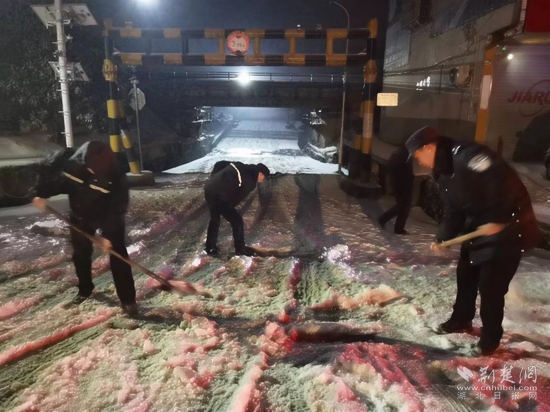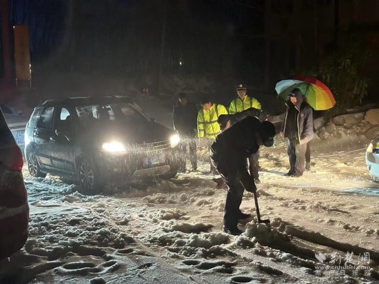 赤壁市公安局民警立即冒雪進行救助,最大限度為受困受阻車輛司乘人員提供幫助。同時對路面進行緊急清理,消除安全隱患,現(xiàn)場疏導(dǎo)車流,確保盡快恢復(fù)正常通行。