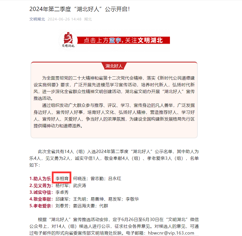 荊楚網(wǎng)(湖北日?qǐng)?bào)網(wǎng))訊(記者呂鑒蕾 通訊員華文莉)6月26日,2024年第二季度“湖北好人”名單集中公示,全省共有14人(組)上榜。其中,黃石開(kāi)發(fā)區(qū)·鐵山區(qū)汪仁鎮(zhèn)磊山村村民李相育榜上有名。